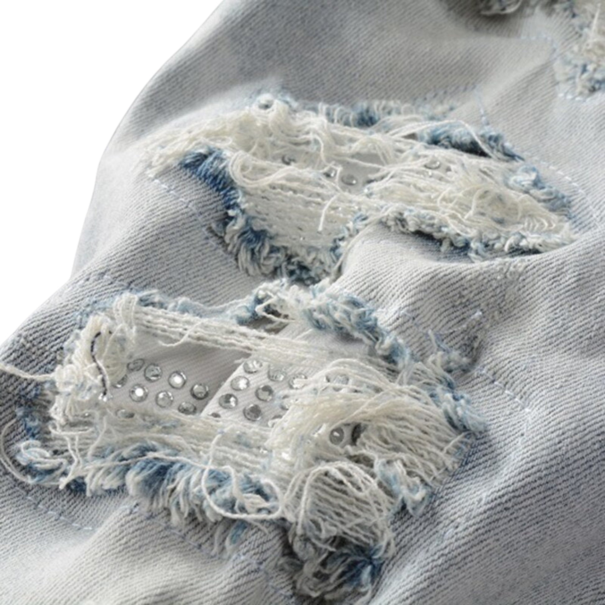 UNLOCK YOUR DRIP. The Azukiro jeans come in a light blue wash with bold ripped details across the front. The frayed edges give them a worn-in look, while the denim fabric keeps them strong and comfortable for everyday wear.