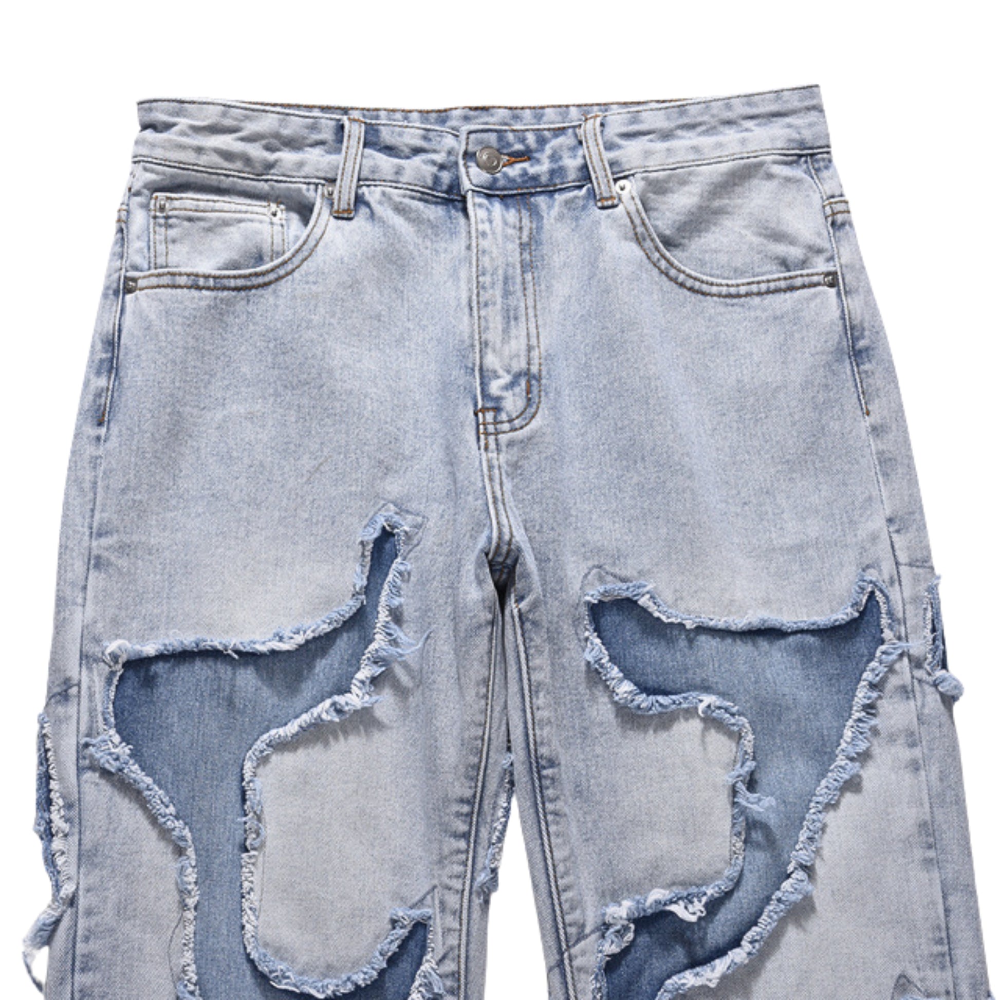 UNLOCK YOUR DRIP. The Hayate jeans bring art and edge together with bold patchwork and rough-cut detailing. The layered denim textures give a worn, vintage feel that stands out anywhere.