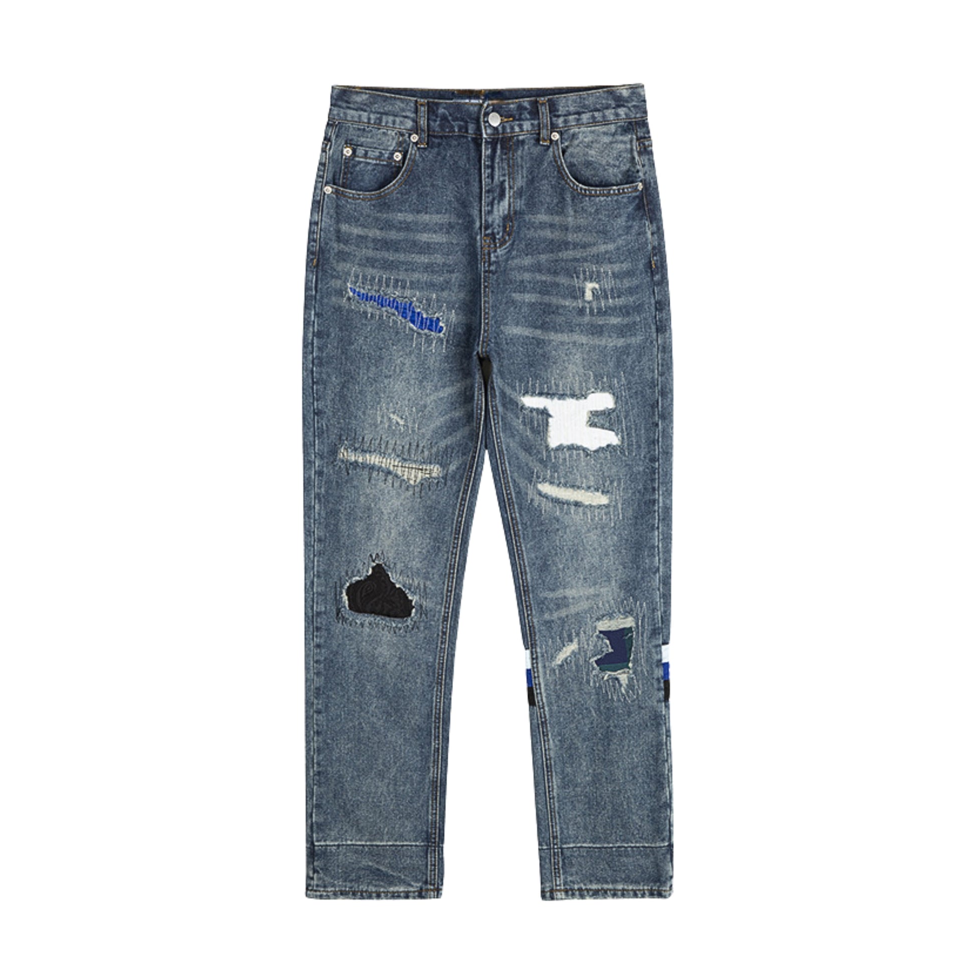 UNLOCK YOUR DRIP. The Vizio jeans bring a bold, rugged look with heavy distressing and contrast patchwork. Built for streetwear lovers who want texture, edge, and attitude in every fit.
