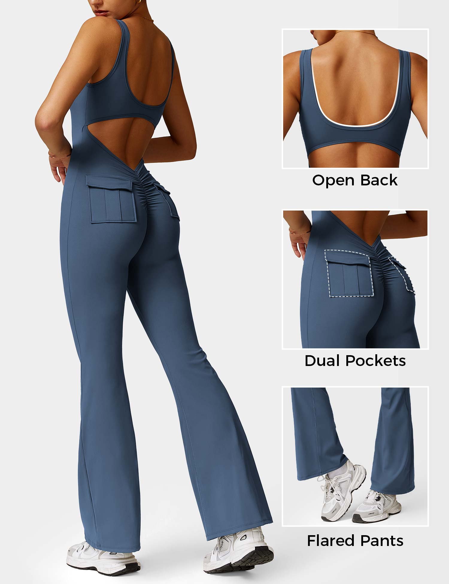 Meet the Lizvette Pockets Jumpsuit, designed to accentuate your curves with a deep V back and sculpting ruching at the hips. Utility pockets add flair, while flared pant legs create a lengthening effect. This versatile piece blends comfort and style, perfect for casual outings and workouts!