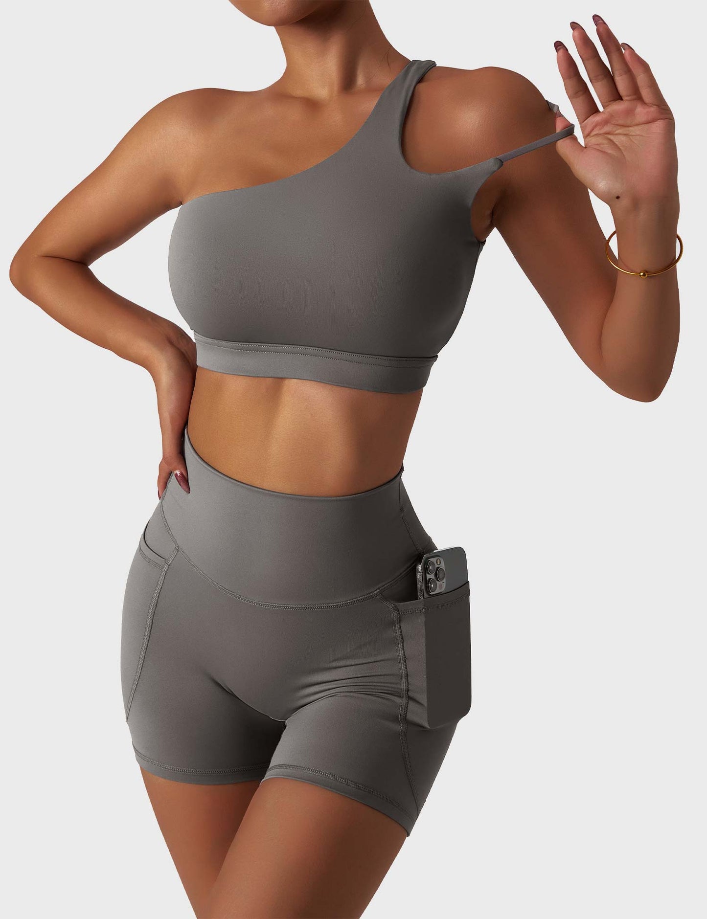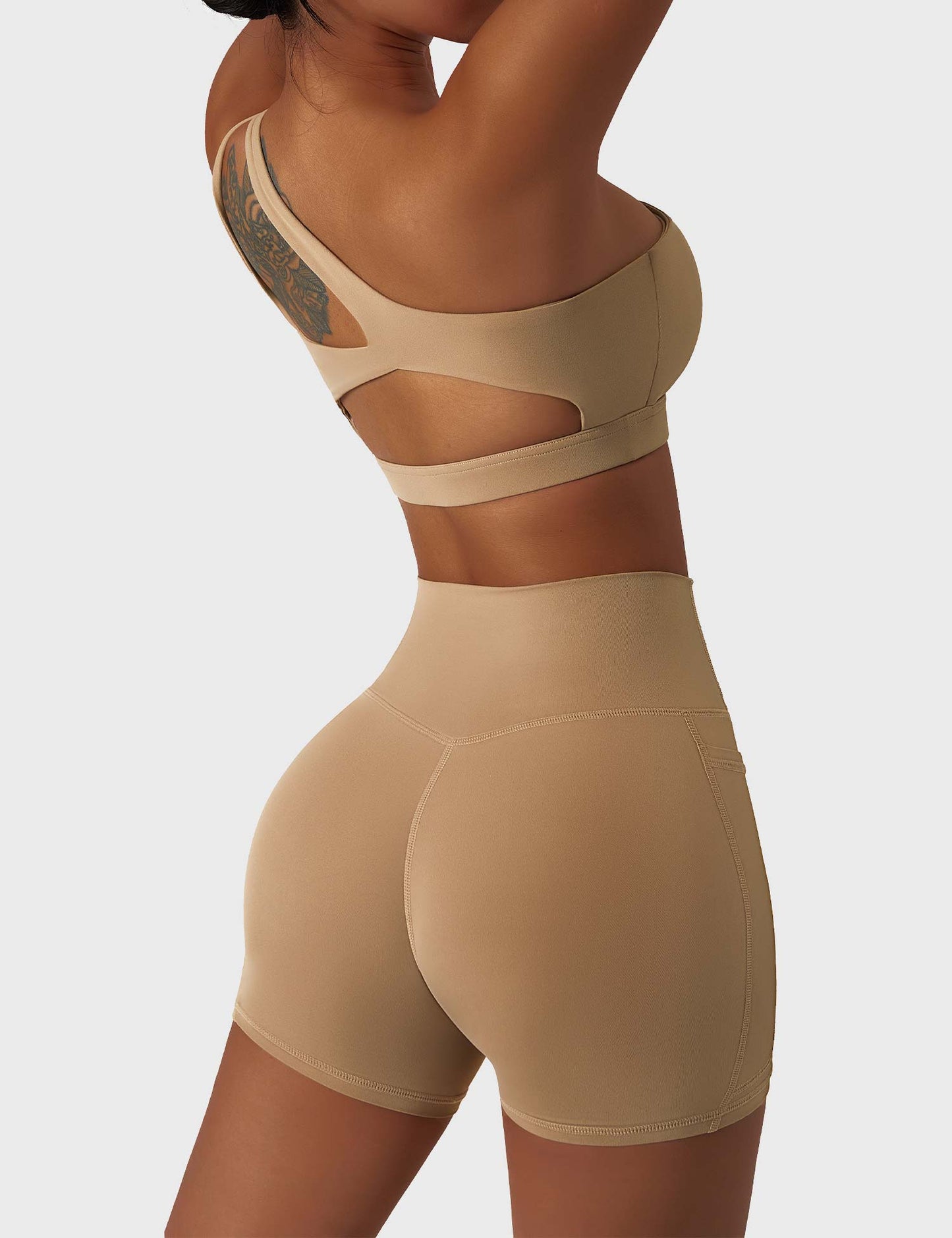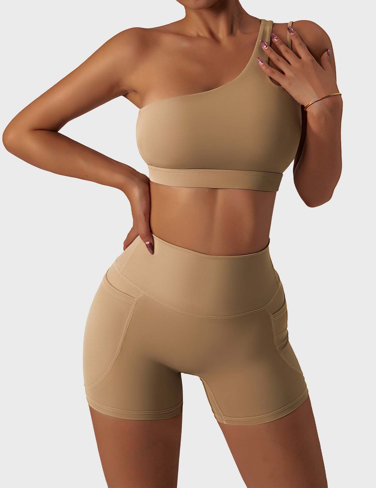 Our athletic fitness set is made from skin-friendly nude fabric for a soft, comfortable fit that's perfect for fitness enthusiasts. The top features an asymmetrical one-shoulder cutout for medium support and comfort. The matching high-waisted shorts and leggings feature a high-waisted design to provide extra shock-absorbing support and a snug fit and come with two exterior pockets on the side large enough to carry small items. Perfect for yoga, pilates, training, and other fitness activities, this fitness set is moderately supportive, squat-proof, and provides a full range of motion. However, please note that adding both the top and bottom to the cart to get a complete set!
