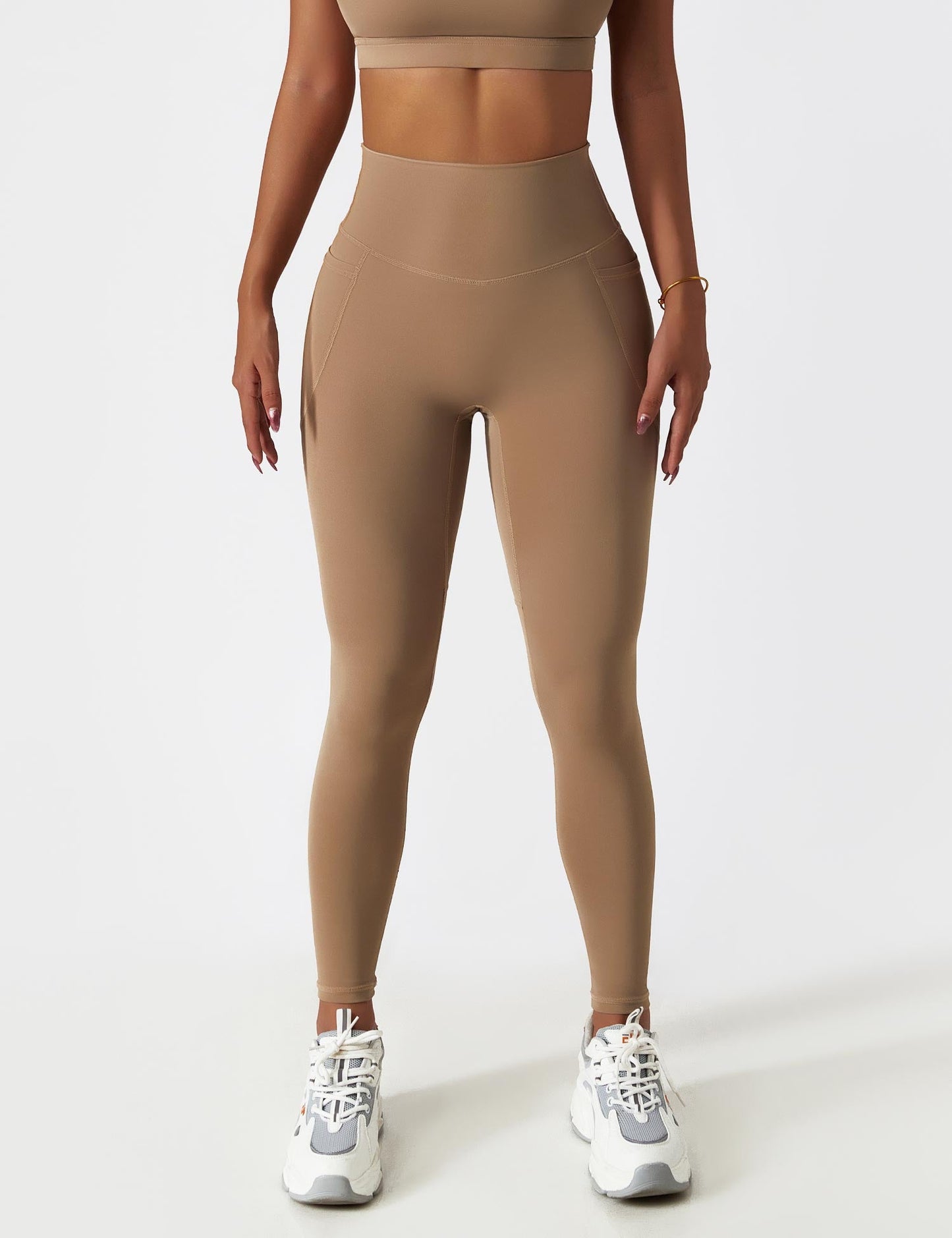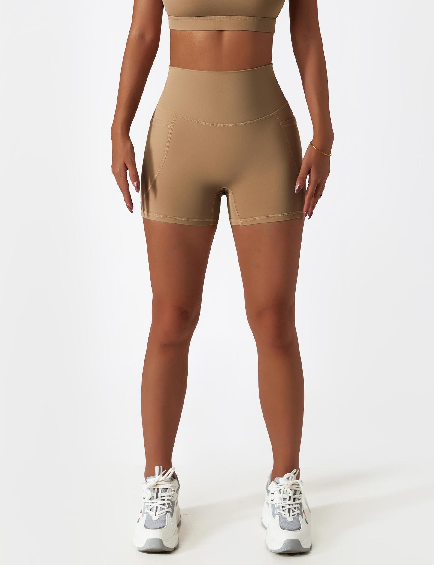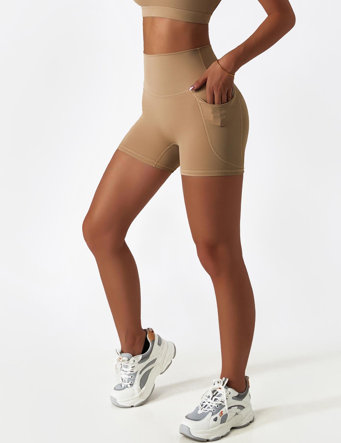 Our athletic fitness set is made from skin-friendly nude fabric for a soft, comfortable fit that's perfect for fitness enthusiasts. The top features an asymmetrical one-shoulder cutout for medium support and comfort. The matching high-waisted shorts and leggings feature a high-waisted design to provide extra shock-absorbing support and a snug fit and come with two exterior pockets on the side large enough to carry small items. Perfect for yoga, pilates, training, and other fitness activities, this fitness set is moderately supportive, squat-proof, and provides a full range of motion. However, please note that adding both the top and bottom to the cart to get a complete set!