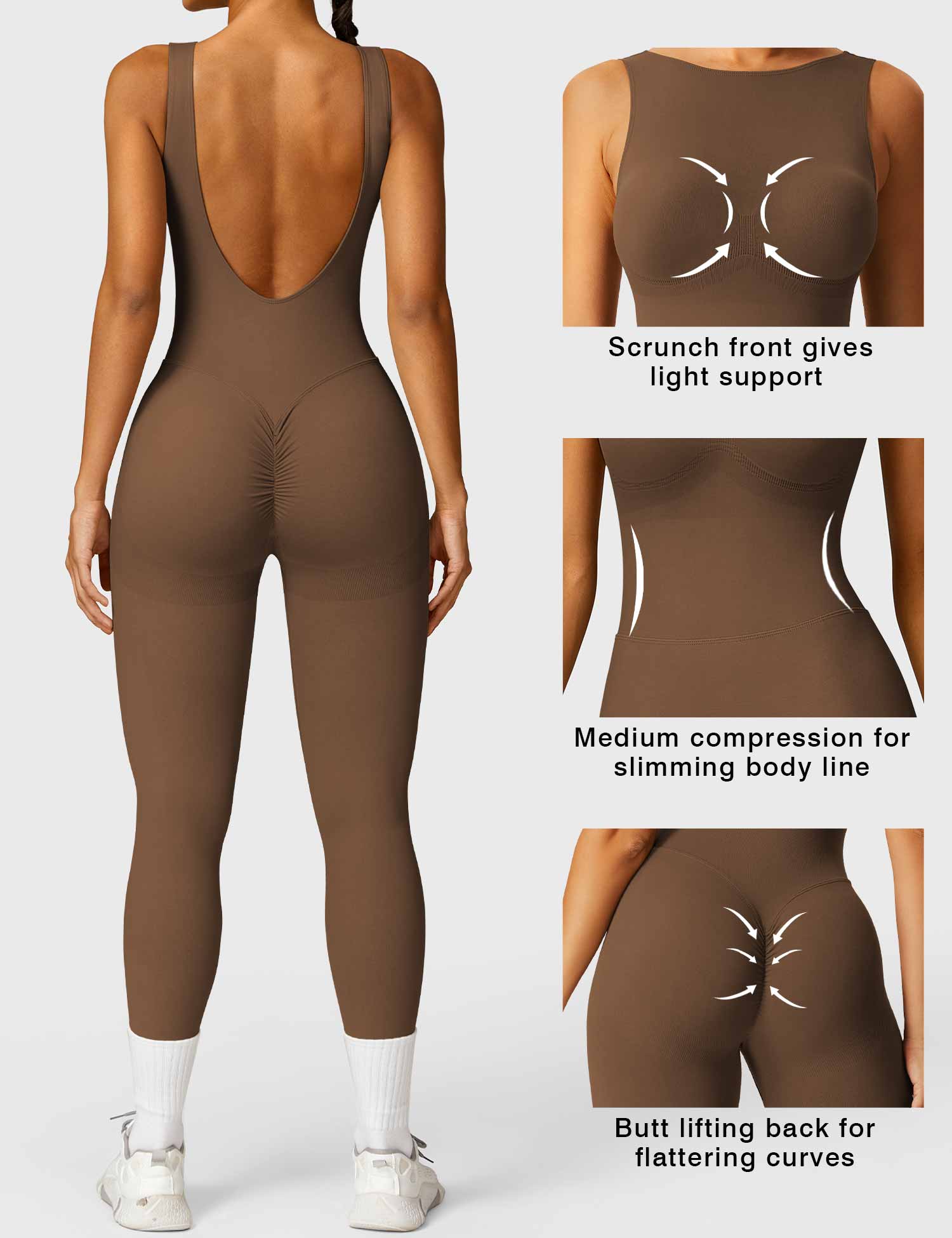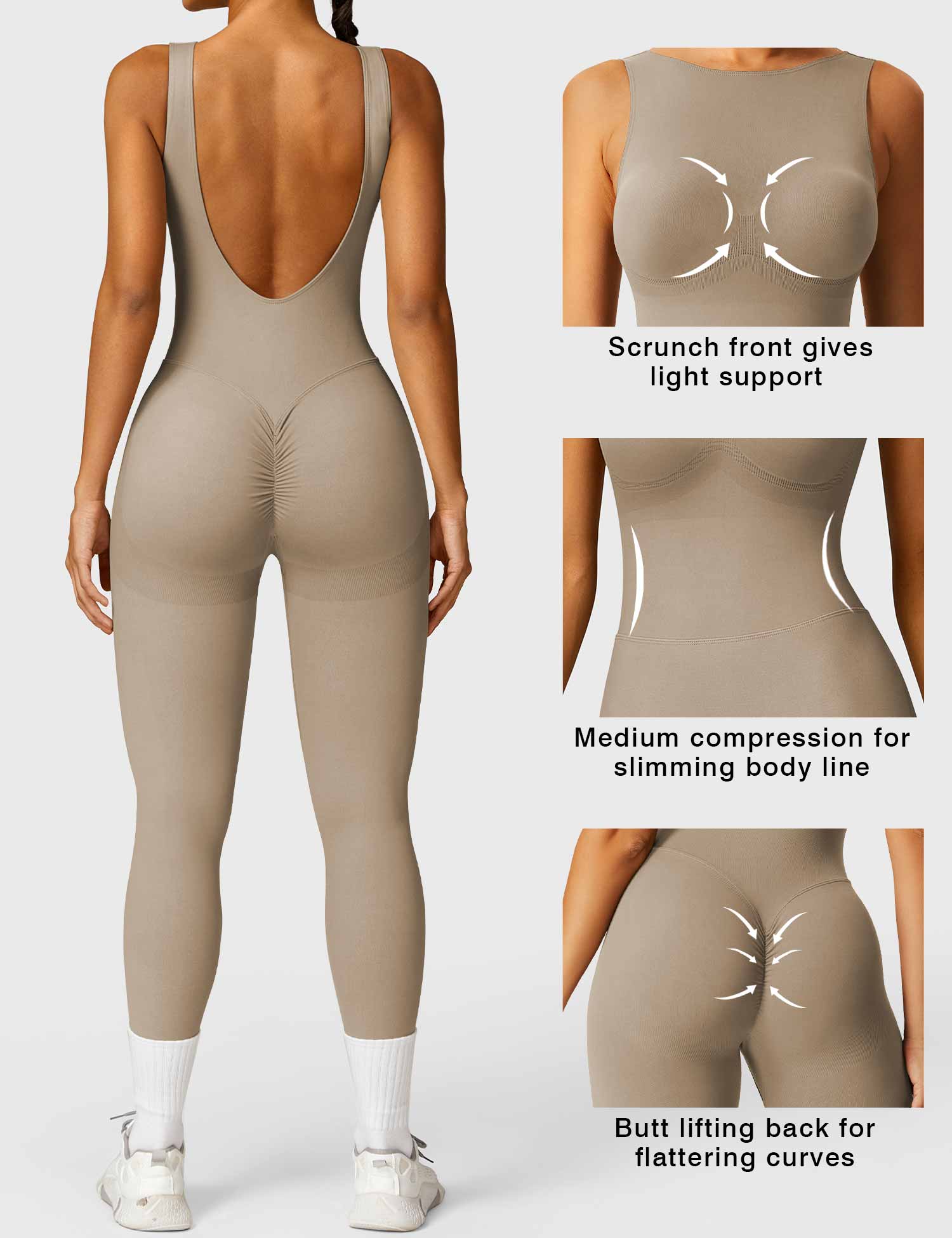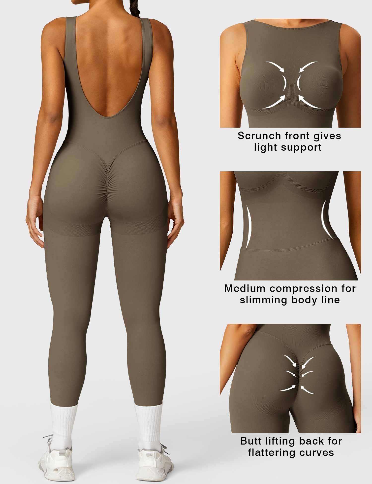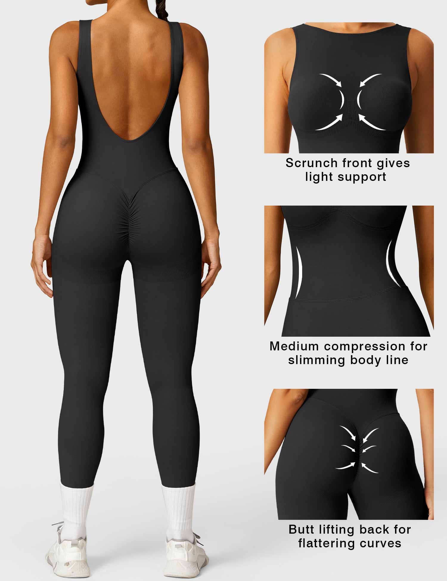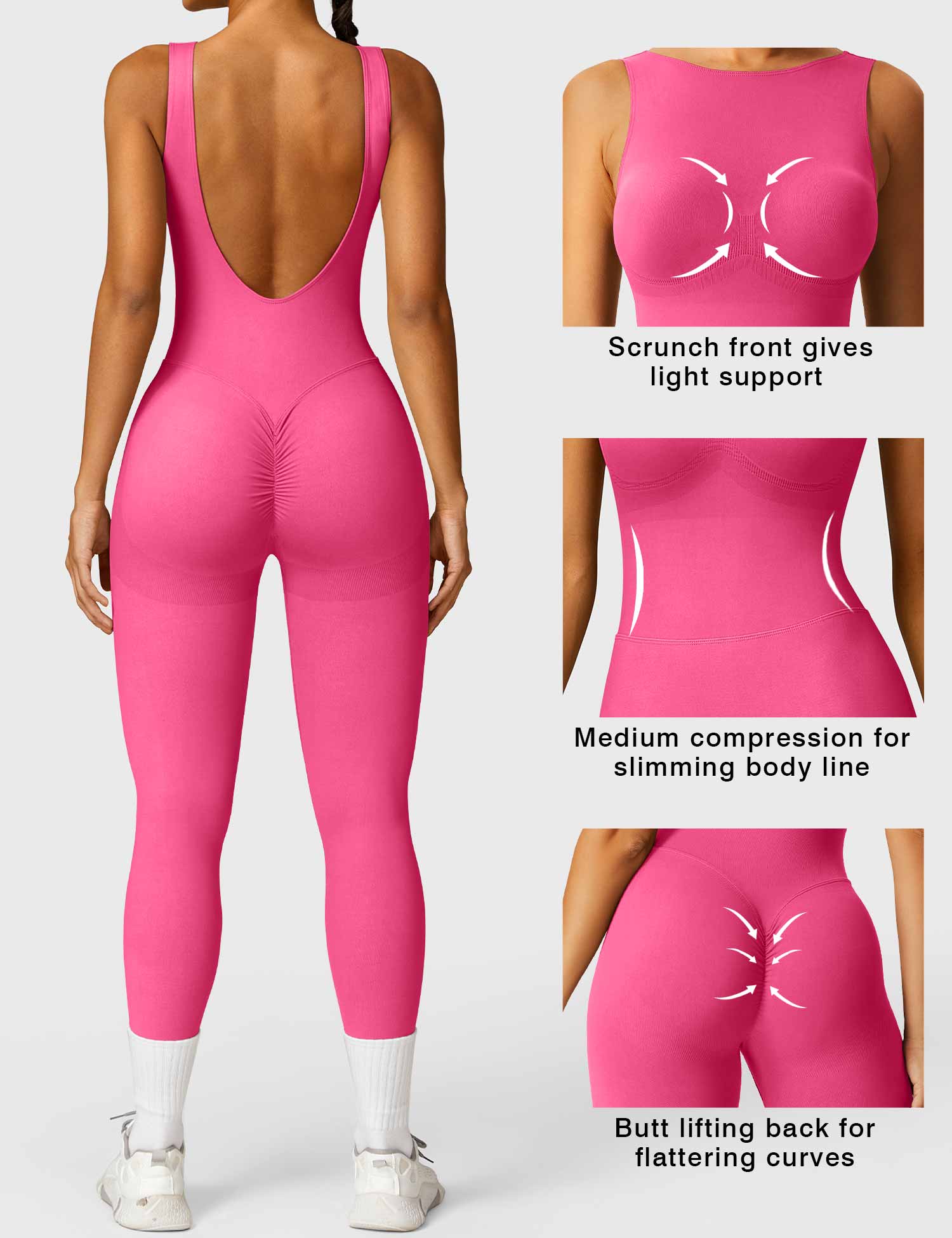 This Swanky Jumpsuit features ruched detailing to enhance your curves. Crafted from high-stretch, smooth fabric, it offers medium to high compression with a stylish high neckline and low back. Stand out in this flattering jumpsuit!
