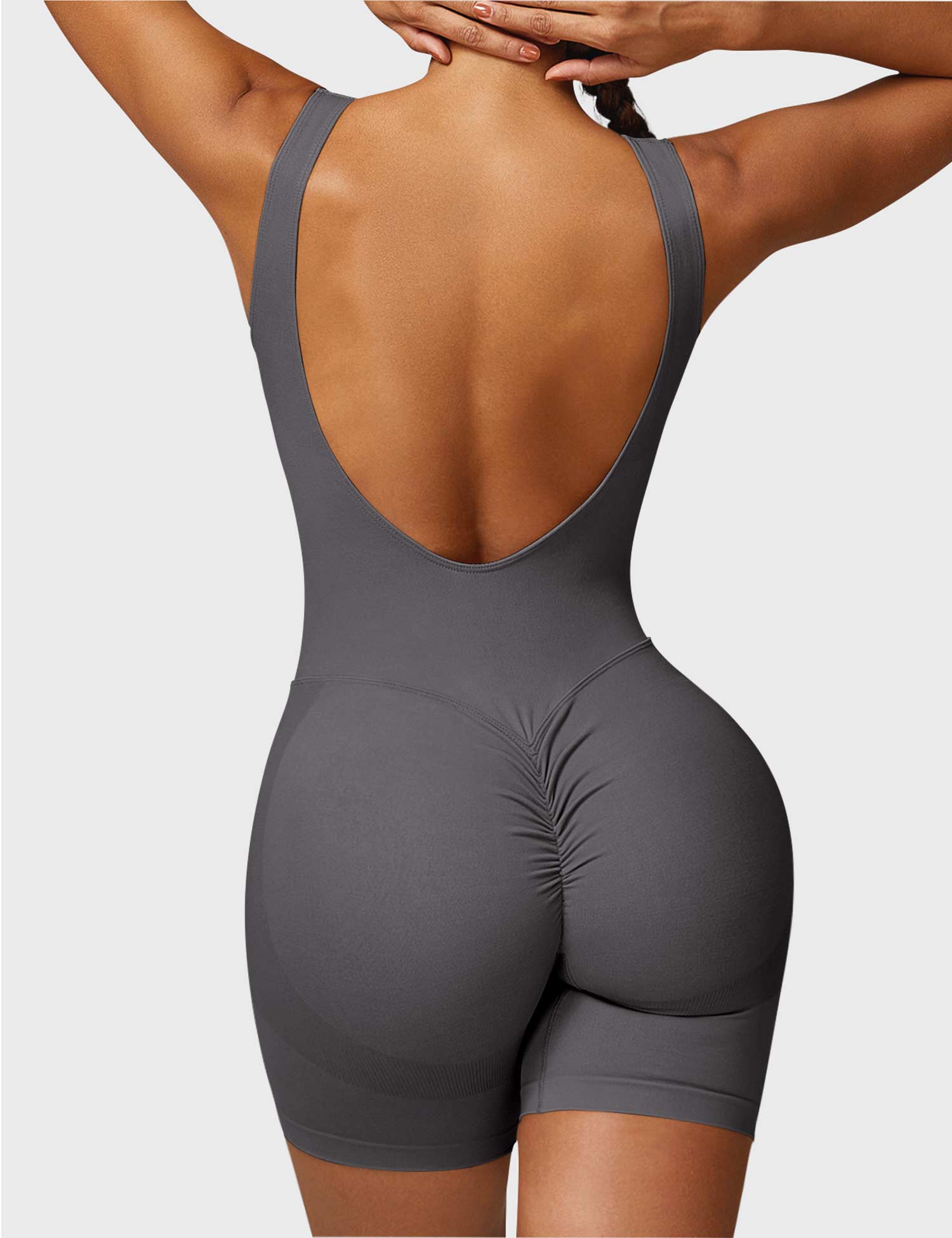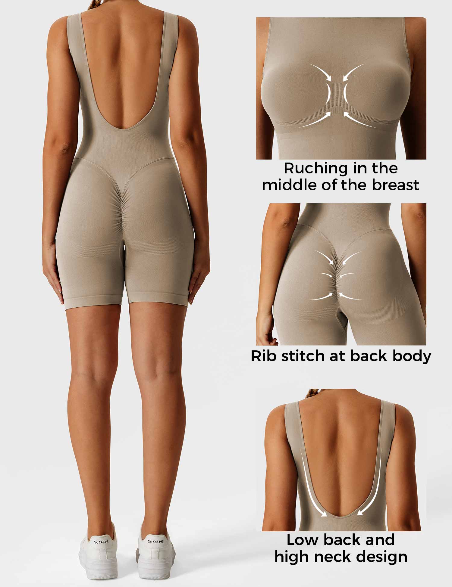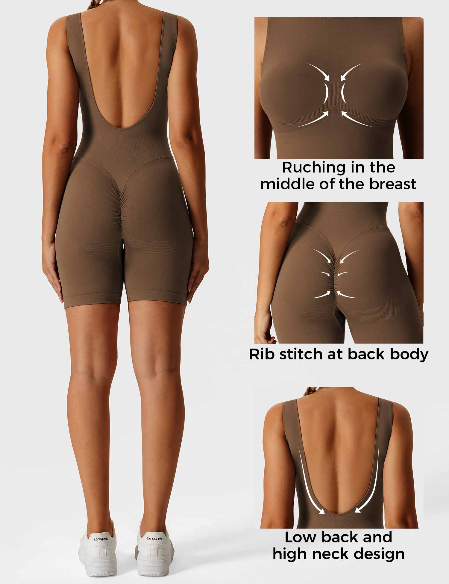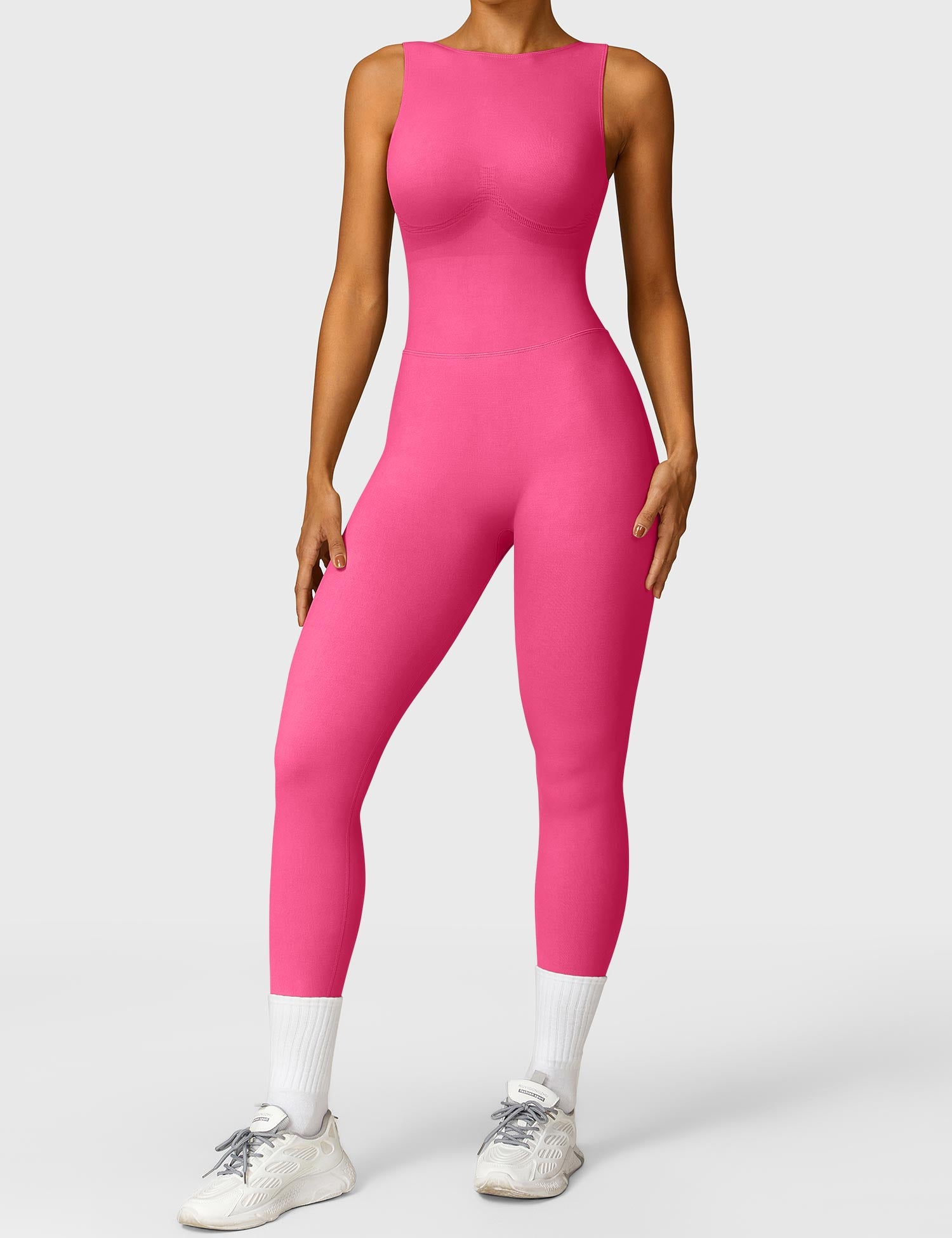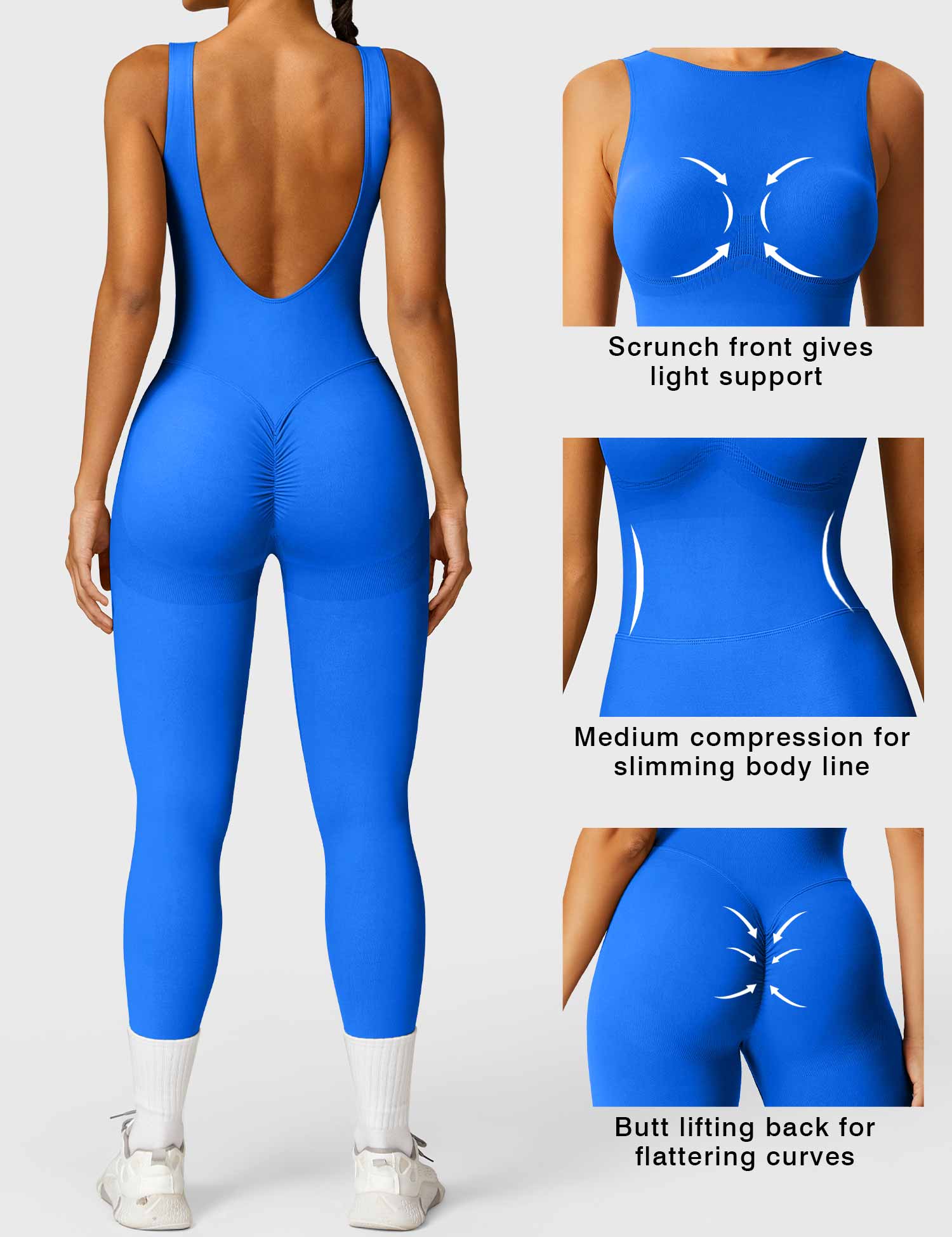 This Swanky Jumpsuit features ruched detailing to enhance your curves. Crafted from high-stretch, smooth fabric, it offers medium to high compression with a stylish high neckline and low back. Stand out in this flattering jumpsuit!