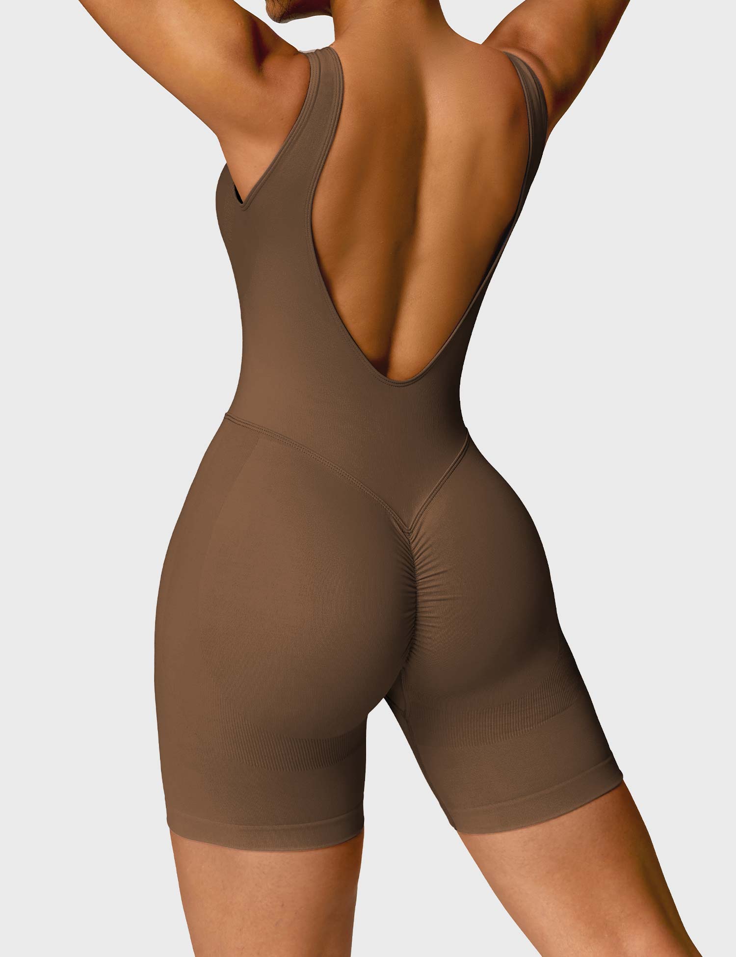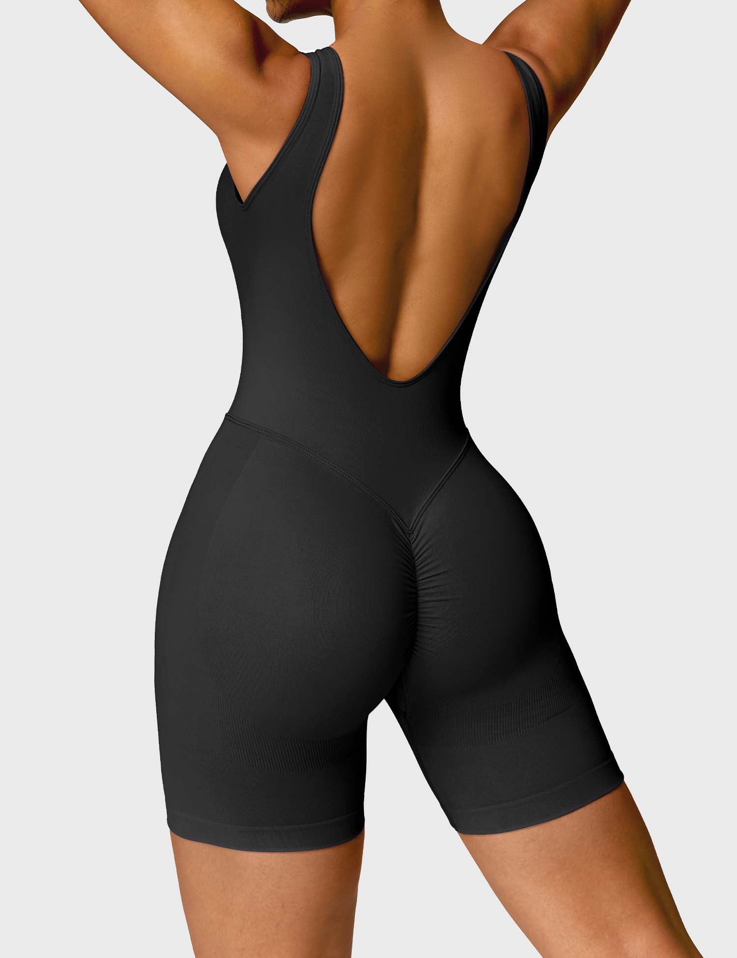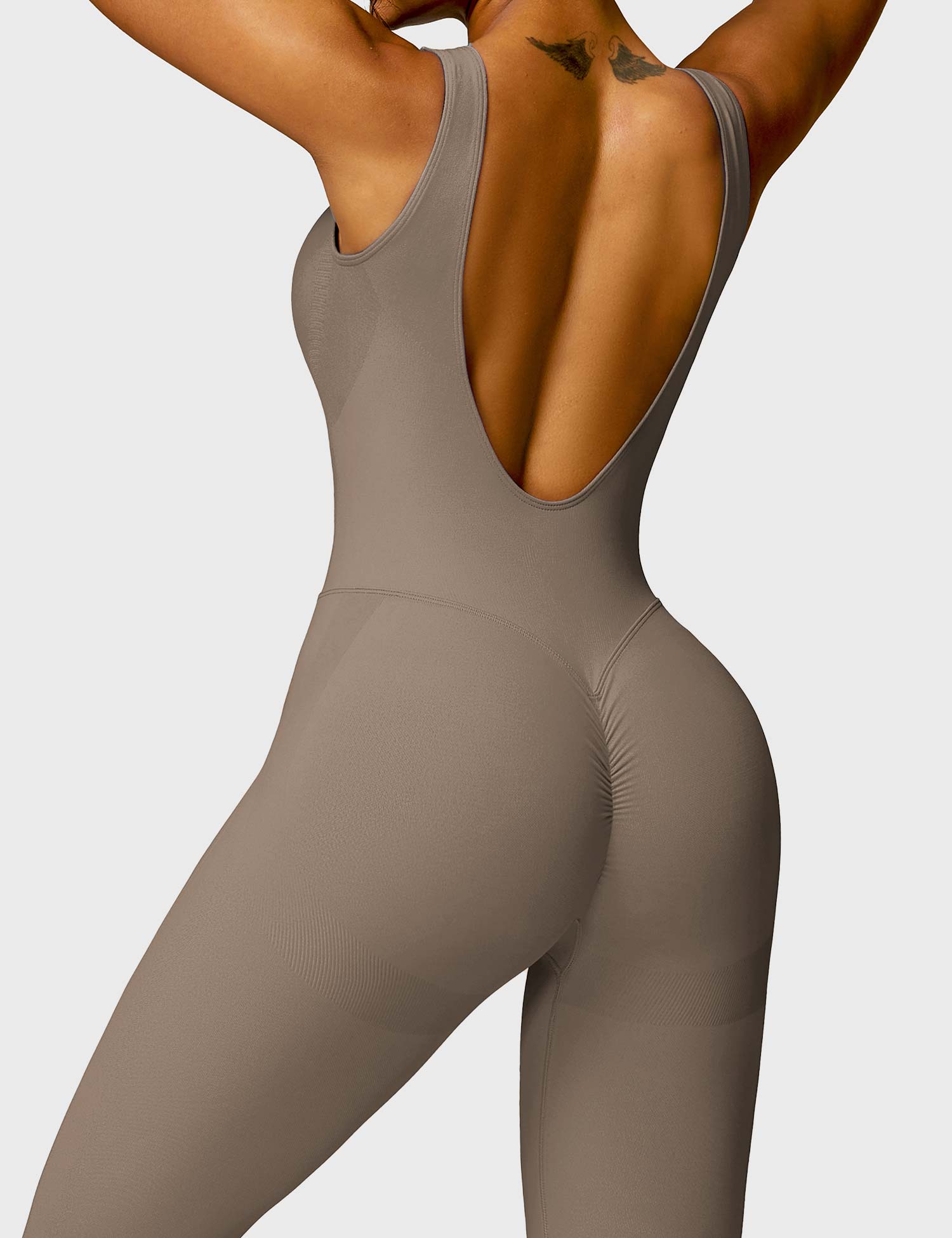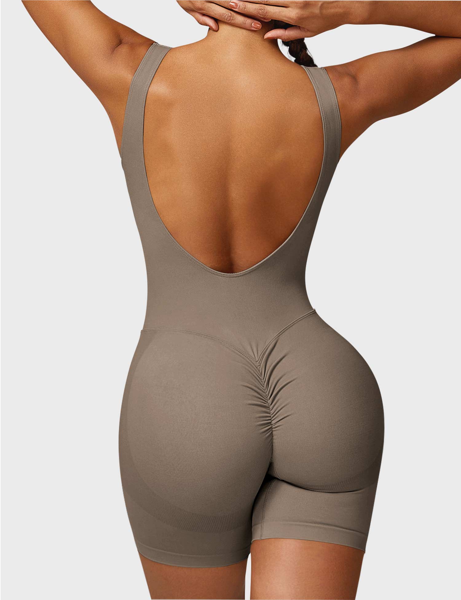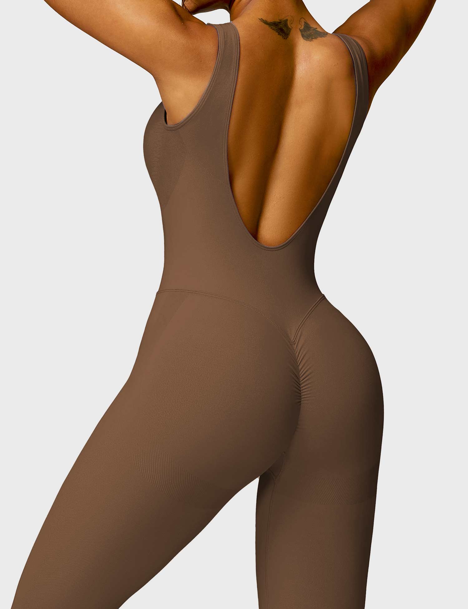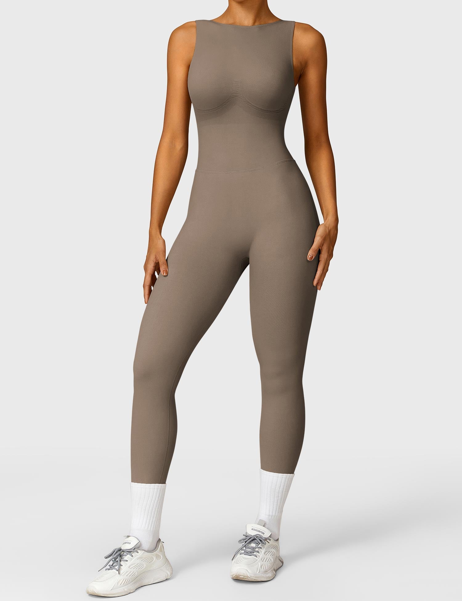 This Swanky Jumpsuit features ruched detailing to enhance your curves. Crafted from high-stretch, smooth fabric, it offers medium to high compression with a stylish high neckline and low back. Stand out in this flattering jumpsuit!